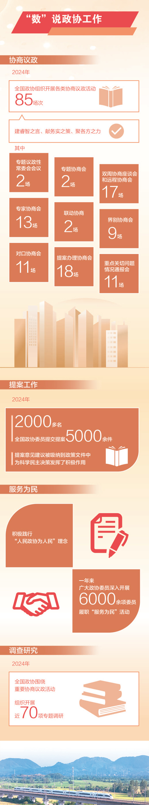 人工智能、綠色低碳、新質生產力、文化遺產保護、人口高質量發展、金融高質量發展……協商議題緊扣“國之大者”和民之關切;專題議政性常委會會議、專題協商會、雙周協商座談會、遠程協商會、專家協商會、界別協商會、提案辦理協商會……協商形式豐富多樣,過去一年,全國政協組織開展各類協商議政活動85場次。一年來,全國政協把協商議政工作放到黨和國家工作大局中精準定位、科學謀劃,聚焦推進中國式現代化,建睿智之言、獻務實之策、聚各方之力,協商議政質量和成效不斷提升。