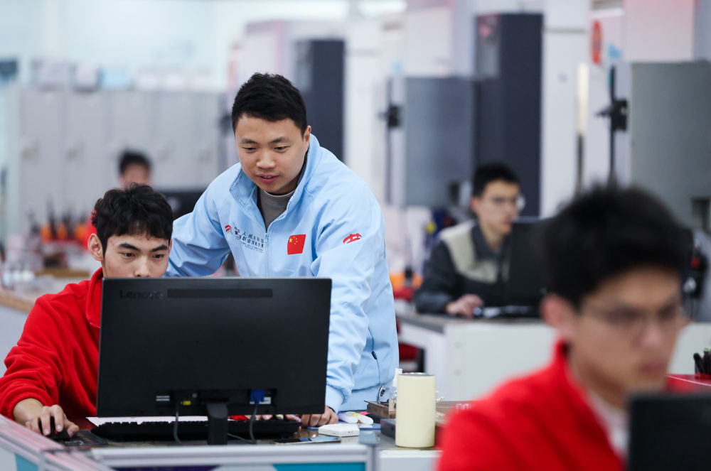 楊登輝(左二)指導學生對器件數控銑加工進行程序編程。