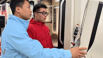 楊俊(左二)和同事為客戶展示一款行業應用四足機器人。