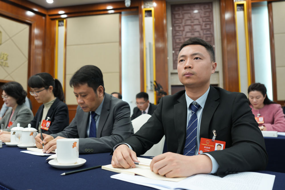 楊登輝(前右一)在十四屆全國人大三次會議廣東代表團全體會議上認真聽取發言。