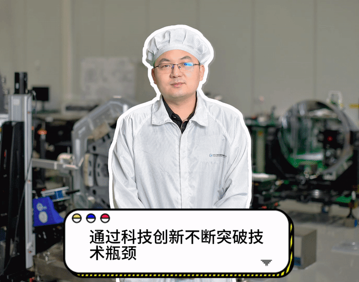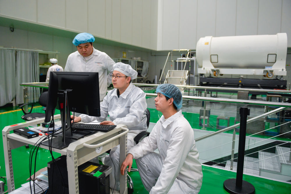 在長光衛星相機裝調間,王升(右二)在調試衛星光學遙感載荷組件時與團隊成員討論細節。