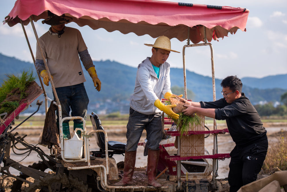 多年生稻科技小院的學生(右一)幫助當地農民一起插秧。