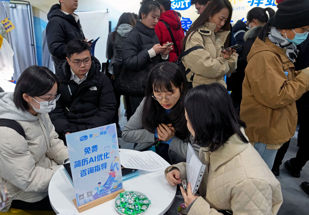 在上海一個大型招聘會現場,工作室團隊為求職者進行簡歷優化指導。