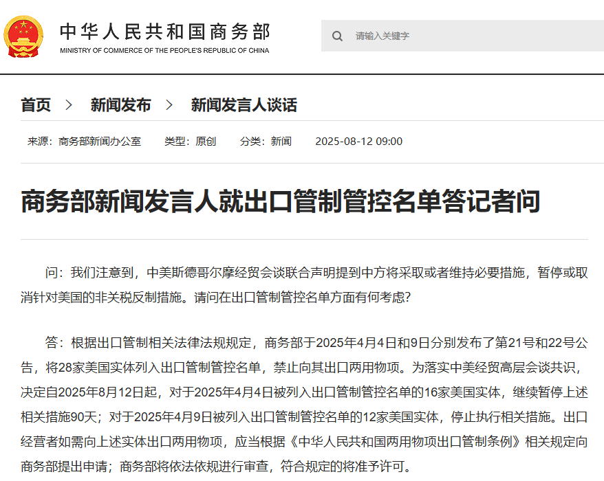 答:根據出口管制相關法律法規規定,商務部于2025年4月4日和9日分別發布了第21號和22號公告,將28家美國實體列入出口管制管控名單,禁止向其出口兩用物項。為落實中美經貿高層會談共識,決定自2025年8月12日起,對于2025年4月4日被列入出口管制管控名單的16家美國實體,繼續暫停上述相關措施90天;對于2025年4月9日被列入出口管制管控名單的12家美國實體,停止執行相關措施。出口經營者如需向上述實體出口兩用物項,應當根據《中華人民共和國兩用物項出口管制條例》相關規定向商務部提出申請;商務部將依法依規進行審查,符合規定的將準予許可。