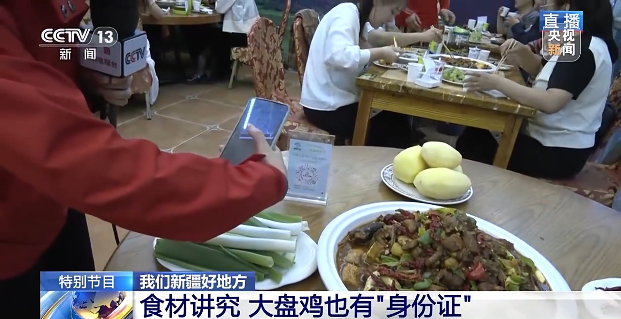 其實(shí),大盤雞里的每一種原料,都是新疆農(nóng)業(yè)發(fā)展的縮影。先說這最主要的雞肉,是來自當(dāng)?shù)貥?biāo)準(zhǔn)化散養(yǎng)的土雞,這可不是一般的雞,它讓大盤雞有了“電子身份證”,我們來掃碼看看。
