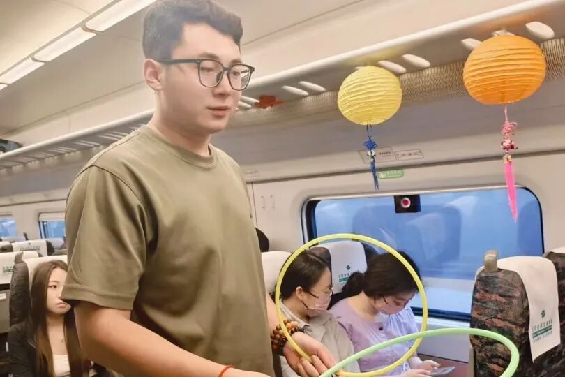 車廂內(nèi),懸掛的燈籠點綴出濃濃節(jié)日氣息。青年職工演唱歌曲《看月亮爬上來》,熟悉的旋律引發(fā)旅客共鳴;“舉頭望明月(打一中藥名)”等趣味猜燈謎活動,吸引不少旅客踴躍參與;身著漢服的乘務(wù)員帶領(lǐng)孩子們玩起傳統(tǒng)套圈游戲,月餅、玩偶作獎品,歡聲笑語不斷。