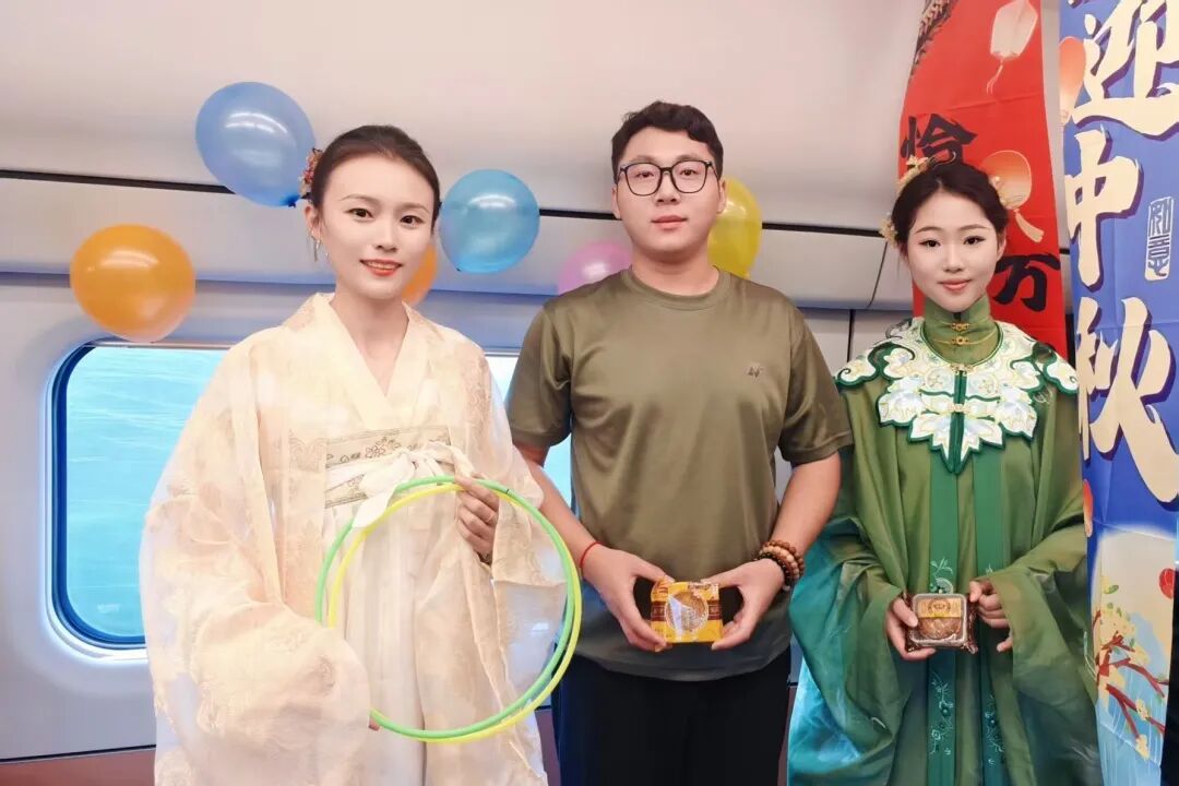 熱鬧的活動讓車廂變成歡樂的海洋,列車員將月餅等精美伴手禮送給旅客,為他們送上節(jié)日的祝福。
