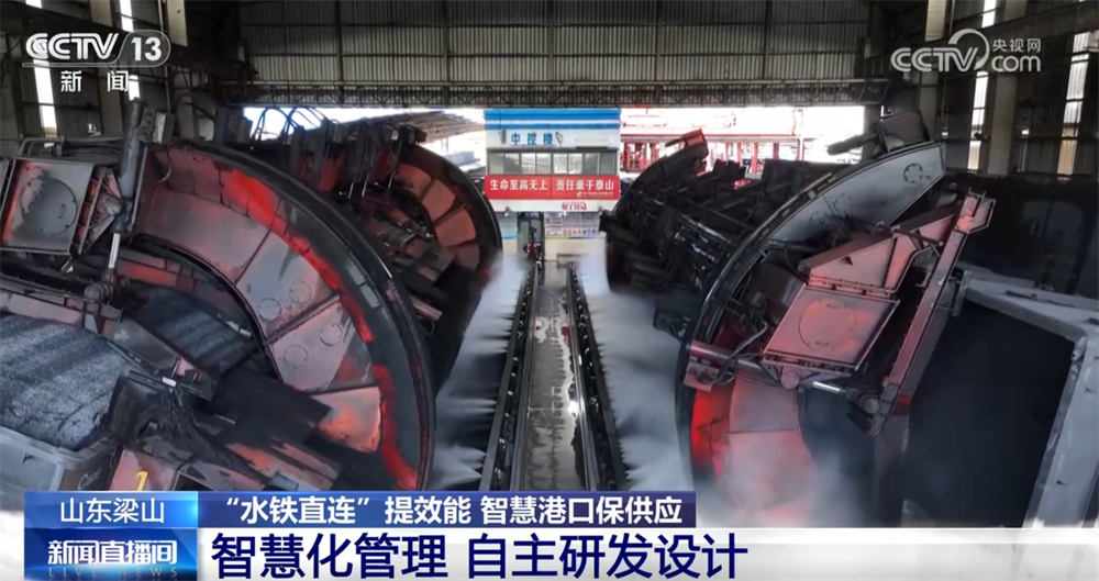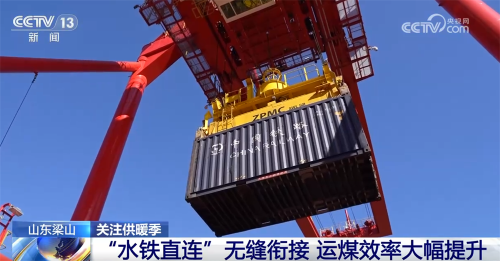 在現場,大家可以看到大型起重機正在往船上裝集裝箱,這是今年港口新推出的一種“水鐵直連”的煤炭運轉模式,就是把集裝箱的煤通過鐵路運到這里,不再經過卸煤和存儲的過程,而是通過精準的需求調度把集裝箱直接裝船,通過運河發往目的地。這種方式大幅縮短了煤炭運輸的周期,把整個周期從5天縮短到3天,也提升了港口能源保障的效率和能力。