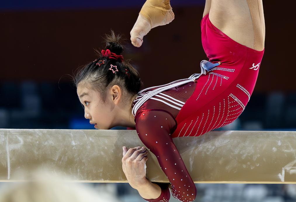 11月11日,廣東隊選手柯沁沁在平衡木比賽中。
