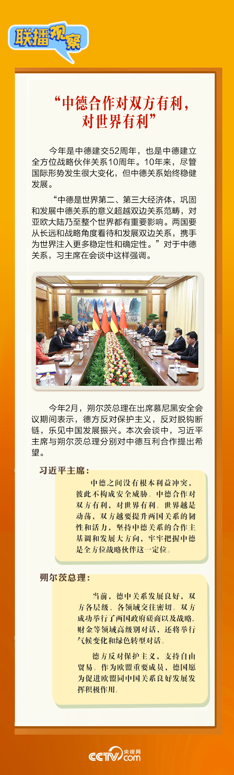 4月16日上午,習近平主席在北京釣魚臺國賓館會見朔爾茨總理。會見中,習主席強調,要“牢牢把握中德是全方位戰略伙伴這一定位”。中德建立全方位戰略伙伴關系10年來,兩國如何共同發展,相互成就?央視網《聯播觀察》帶您了解。
