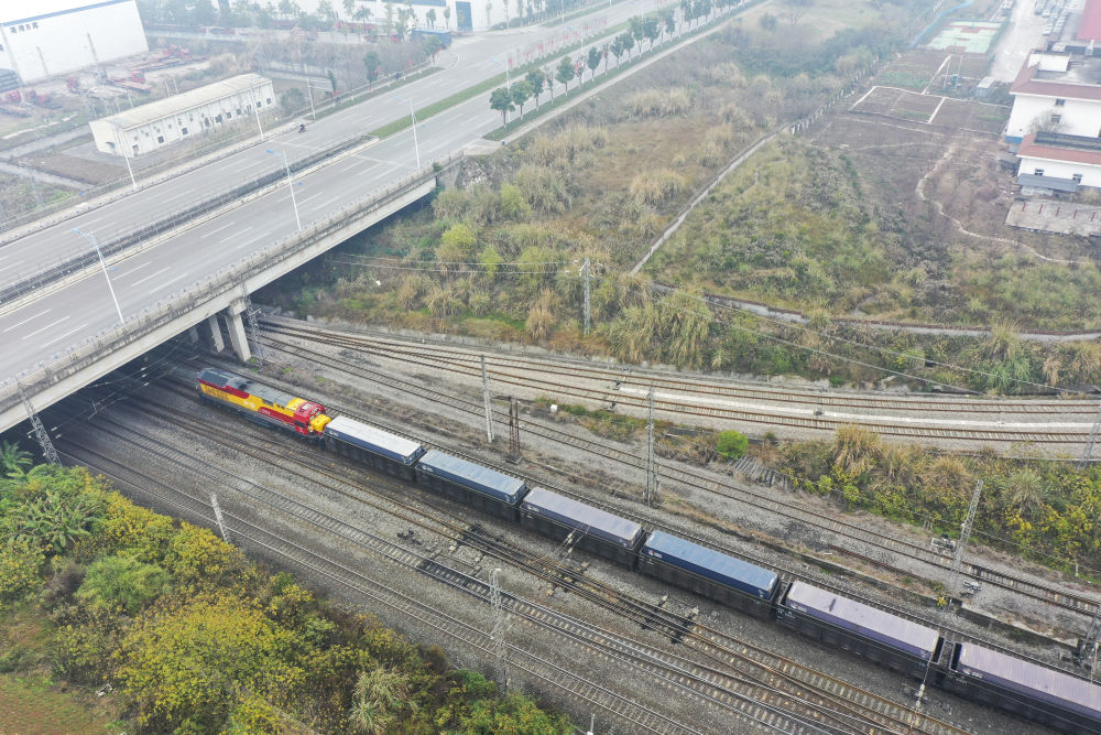2023年1月22日,一趟西部陸海新通道鐵海聯(lián)運班列從重慶團結(jié)村中心站發(fā)車(無人機照片)。班列滿載著汽車、摩托車、發(fā)動機和純堿等共計100個集裝箱的貨物,將經(jīng)廣西欽州港換乘海船去往印度尼西亞、菲律賓、喀麥隆、澳大利亞等國家和地區(qū)。