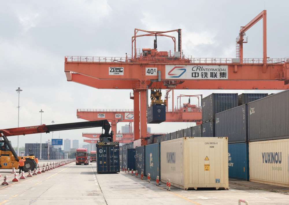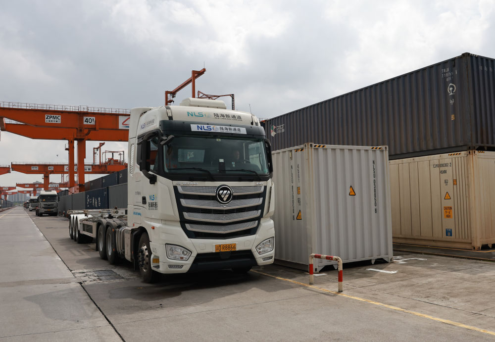 龍門吊不斷起降、轉(zhuǎn)運(yùn)卡車川流不息、火車汽笛聲悠揚(yáng),各色的集裝箱整齊排放,“陸海新通道”的圖標(biāo)引人注目……重慶國際物流樞紐園區(qū)到處活力涌動。