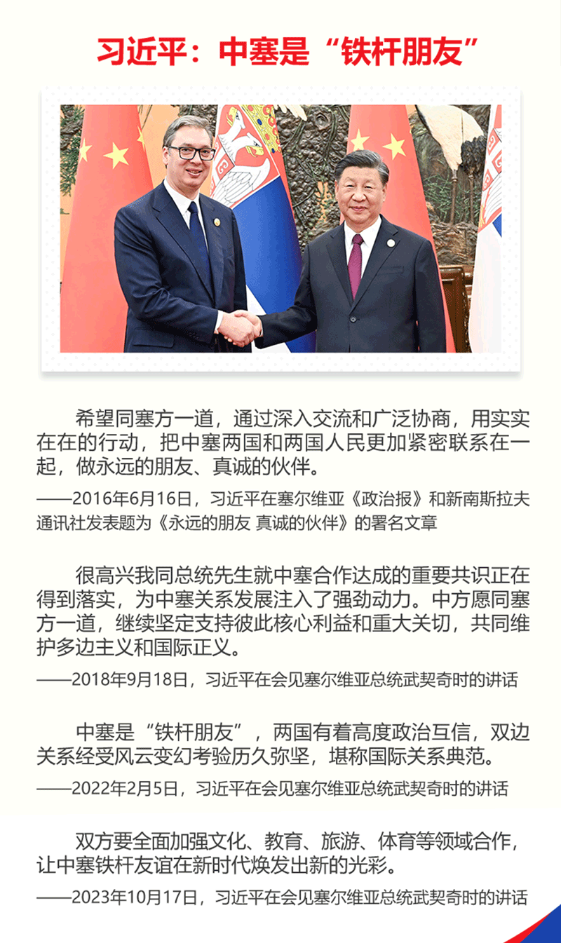 這是時隔近八年,習主席再次對塞爾維亞進行國事訪問。中塞是“鐵桿朋友”,習主席指出,希望同塞方一道,通過深入交流和廣泛協商,用實實在在的行動,把中塞兩國和兩國人民更加緊密聯系在一起,做永遠的朋友、真誠的伙伴。
