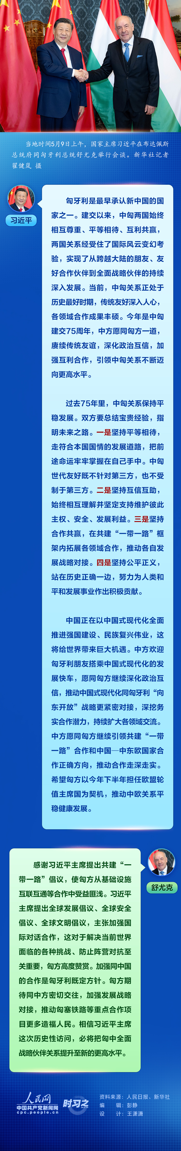 當地時間5月9日上午,國家主席習近平在布達佩斯總統府同匈牙利總統舒尤克舉行會談。習近平指出,今年是中匈建交75周年,中方愿同匈方一道,賡續傳統友誼,深化政治互信,加強互利合作,引領中匈關系不斷邁向更高水平。