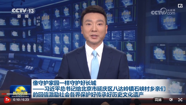 習近平總書記5月14日給北京市延慶區八達嶺鎮石峽村的鄉親們回信,強調,長城是中華民族的代表性符號和中華文明的重要象征,凝聚著中華民族自強不息的奮斗精神和眾志成城、堅韌不屈的愛國情懷。勉勵鄉親們,帶動更多人了解長城、保護長城,把祖先留下的這份珍貴財富世世代代傳下去。習近平總書記的回信在社會各界引發熱烈反響。