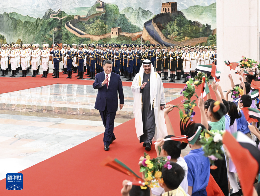 5月30日下午,國(guó)家主席習(xí)近平在北京人民大會(huì)堂同來(lái)華國(guó)事訪問(wèn)并出席中國(guó)-阿拉伯國(guó)家合作論壇第十屆部長(zhǎng)級(jí)會(huì)議開(kāi)幕式的阿聯(lián)酋總統(tǒng)穆罕默德舉行會(huì)談。這是會(huì)談前,習(xí)近平在人民大會(huì)堂北大廳為穆罕默德舉行歡迎儀式。新華社記者 李學(xué)仁 攝