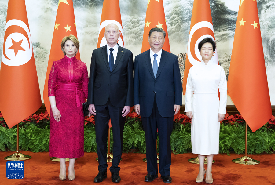 5月31日上午,國家主席習近平在北京人民大會堂同來華國事訪問并出席中國-阿拉伯國家合作論壇第十屆部長級會議開幕式的突尼斯總統賽義德舉行會談。這是會談前,習近平和夫人彭麗媛同賽義德和夫人伊什拉芙合影。新華社記者 黃敬文 攝