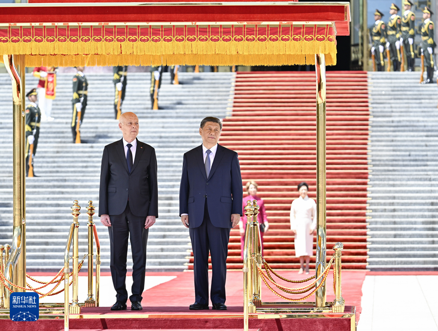 5月31日上午,國家主席習近平在北京人民大會堂同來華國事訪問并出席中國-阿拉伯國家合作論壇第十屆部長級會議開幕式的突尼斯總統賽義德舉行會談。這是會談前,習近平和夫人彭麗媛在人民大會堂東門外廣場為賽義德和夫人伊什拉芙舉行歡迎儀式。新華社記者 殷博古 攝