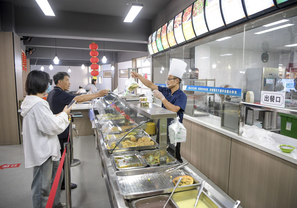 6月20日,寧夏銀川市金鳳區長城花園社區居民在社區食堂買早餐。