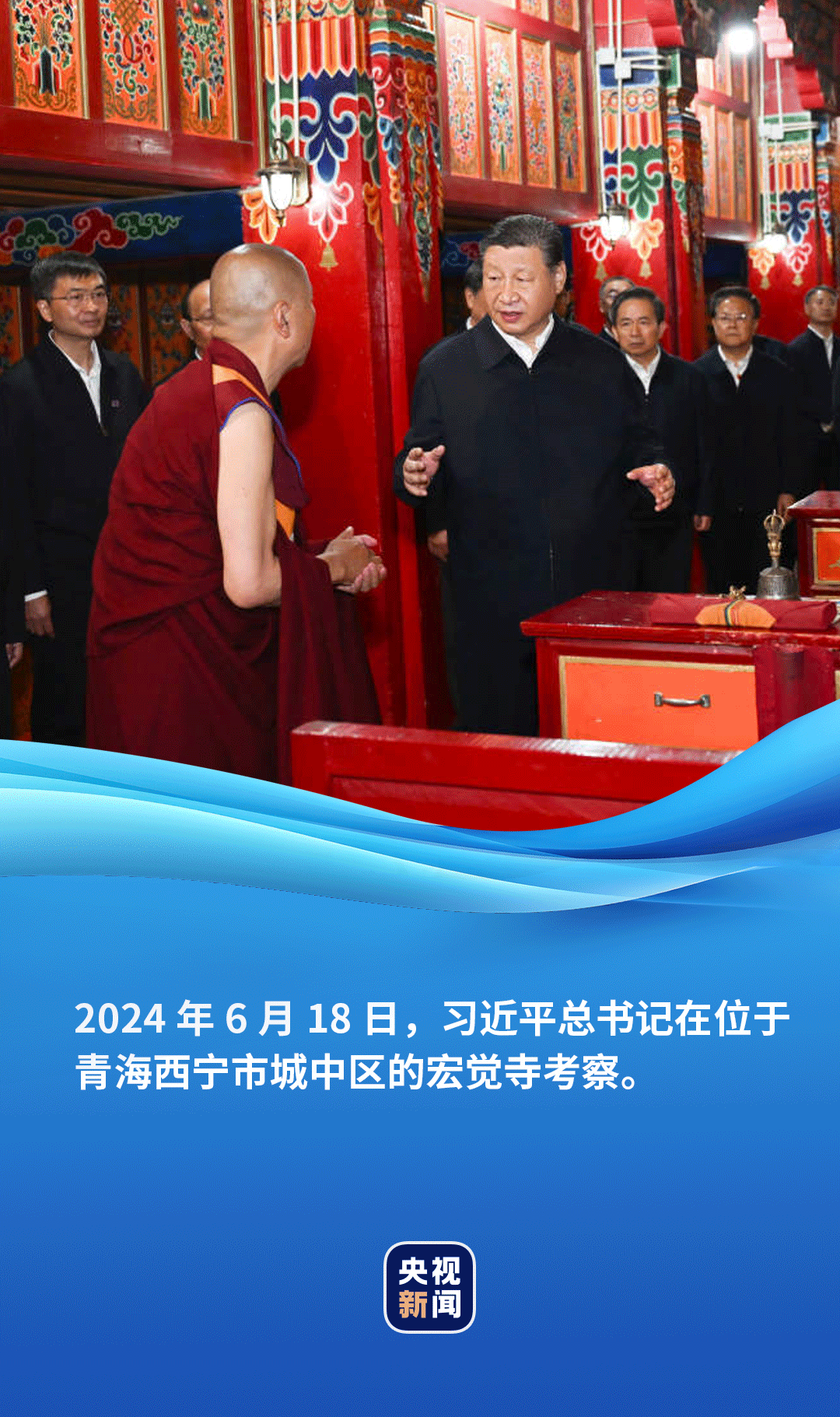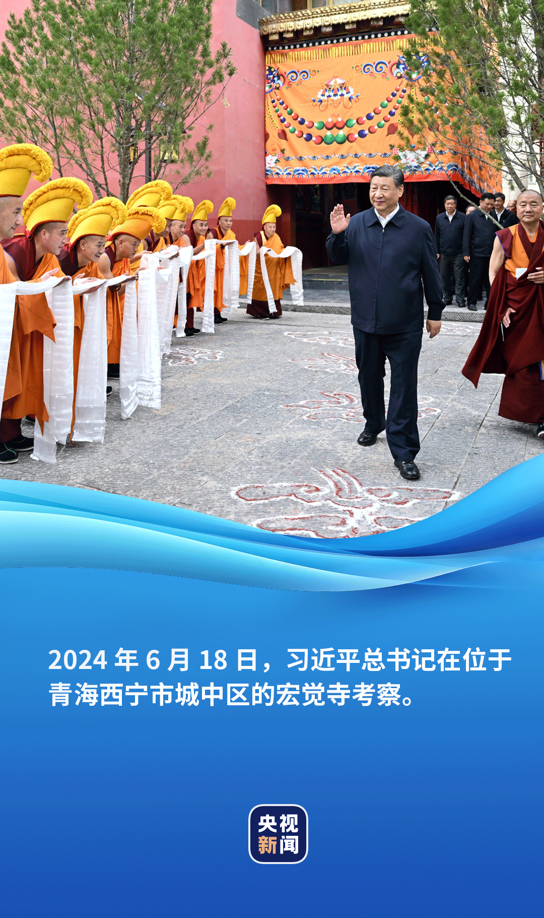 6月18日,正在青??疾斓牧暯娇倳泚淼轿挥谖鲗幨谐侵袇^的宏覺寺。在寺前院落,宏覺寺民主管理委員會負責人向總書記敬獻哈達,僧人提香爐、持寶傘迎接總書記。
