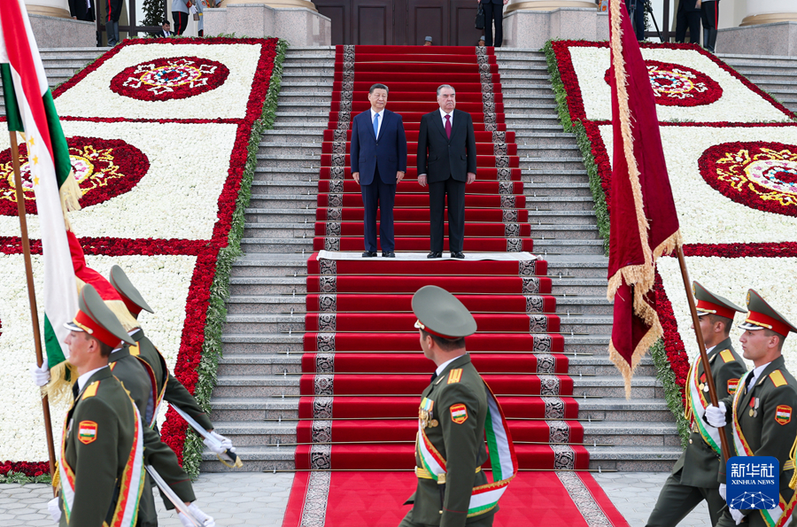 當地時間7月5日下午,國家主席習近平同塔吉克斯坦總統拉赫蒙在杜尚別總統府舉行會談。拉赫蒙為習近平舉行盛大隆重的歡迎儀式。