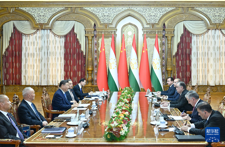 當地時間7月5日下午,國家主席習近平同塔吉克斯坦總統拉赫蒙在杜尚別總統府舉行會談。這是兩國元首舉行大范圍會談。