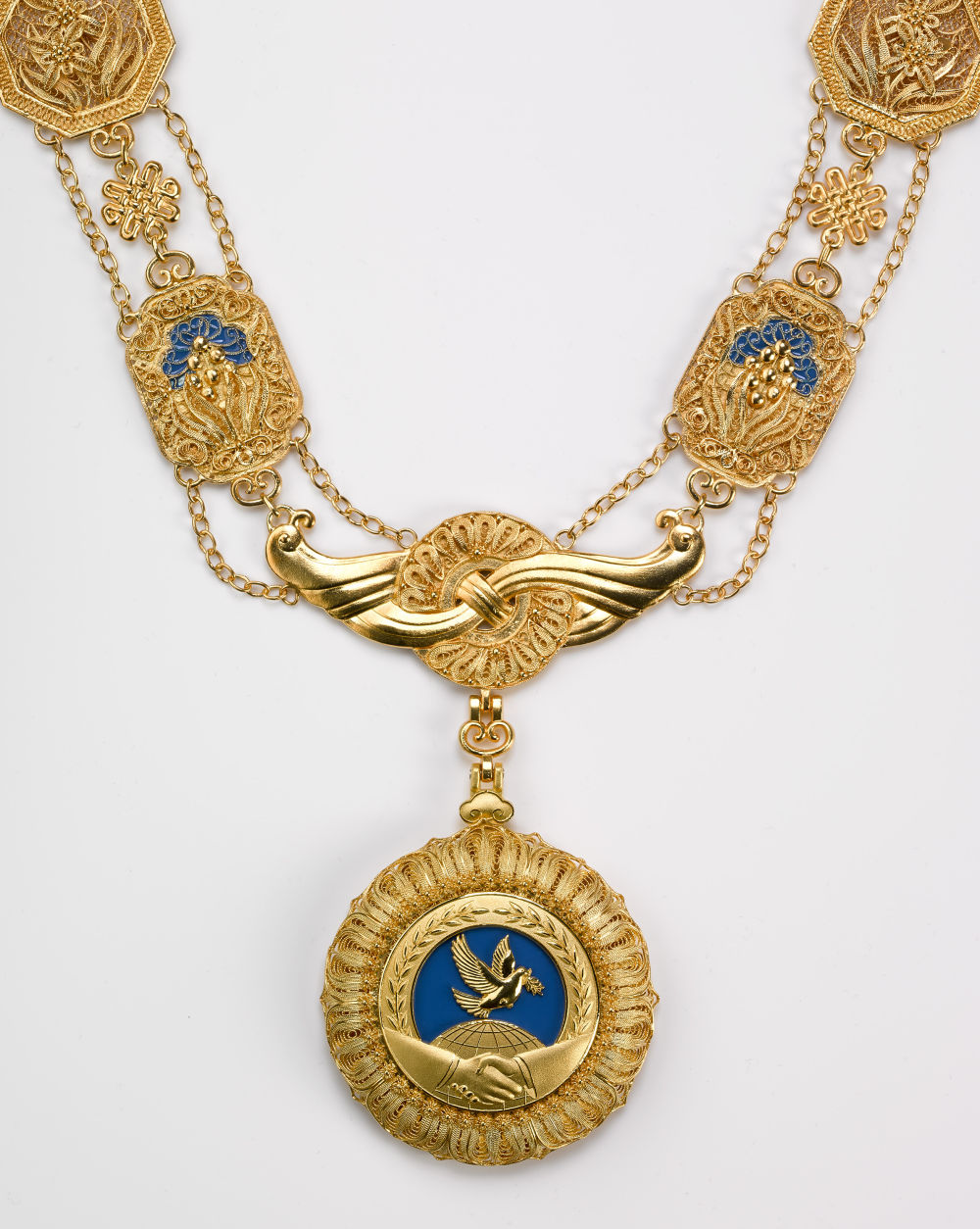 “友誼勛章”章體以金色、藍色為主色調(diào),采用和平鴿、地球、握手、荷花等元素,章鏈采用中國結、萬年青、牡丹花、玉璧、蘭草等元素,整體采用花絲鑲嵌、掐絲琺瑯等傳統(tǒng)工藝手工制作。設計制作象征中國人民同各國人民友好團結、友誼長存,祝愿世界各國共同繁榮發(fā)展。