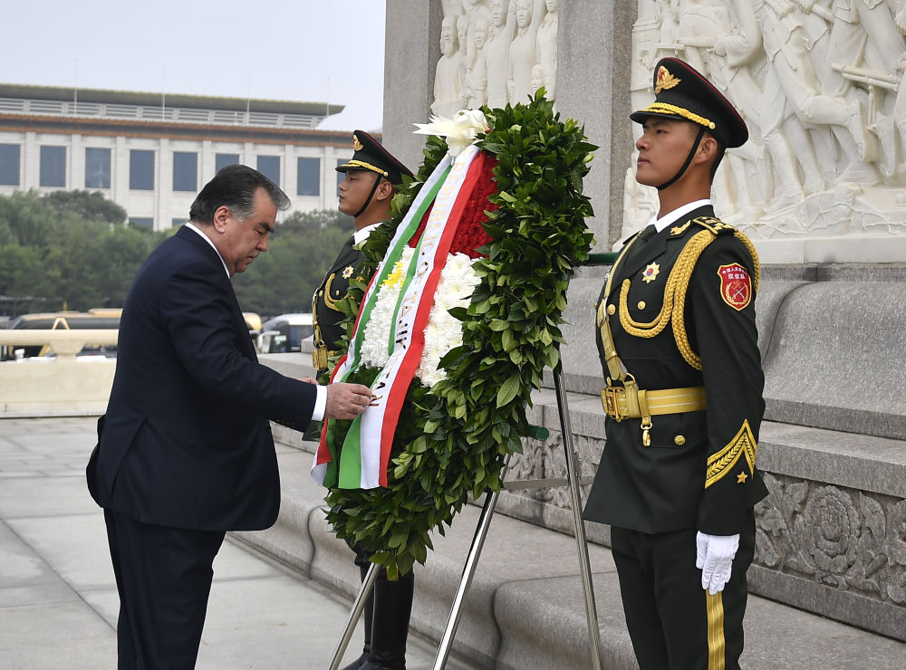 2017年8月31日,塔吉克斯坦總統(tǒng)拉赫蒙前往北京天安門廣場,向人民英雄紀念碑敬獻花圈。