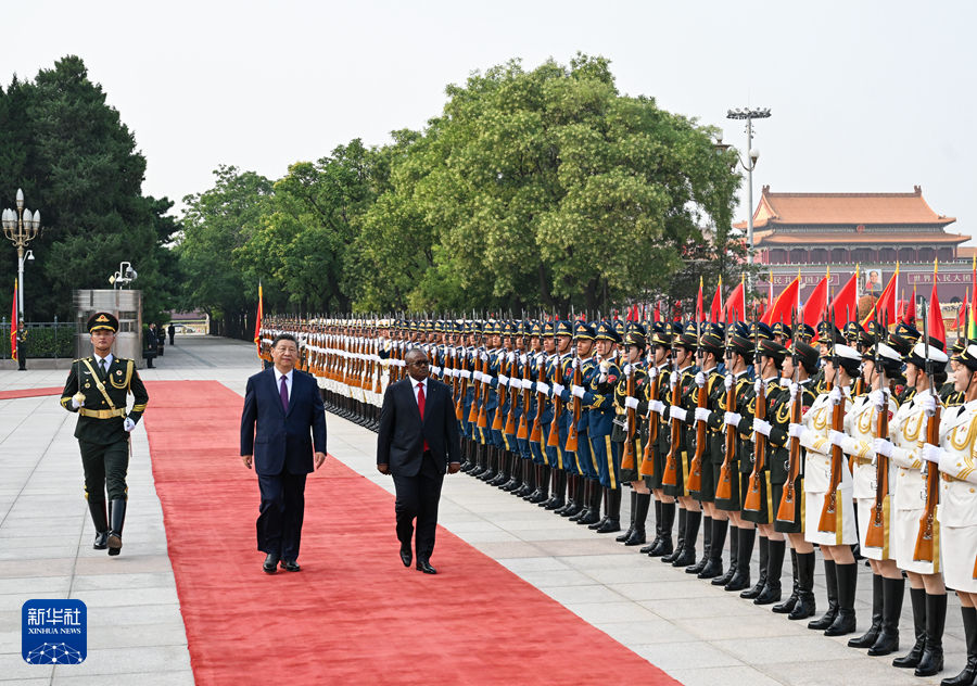 會(huì)談前,習(xí)近平和夫人彭麗媛在人民大會(huì)堂東門外廣場(chǎng)為恩巴洛和夫人迪尼西婭舉行歡迎儀式。