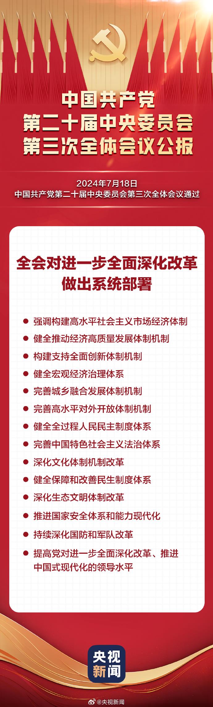 中國共產黨第二十屆中央委員會第三次全體會議于2024年7月15日至18日在北京舉行,全會對進一步全面深化改革做出系統部署,強調構建高水平社會主義市場經濟體制,健全推動經濟高質量發展體制機制,構建支持全面創新體制機制,健全宏觀經濟治理體系,完善城鄉融合發展體制機制,完善高水平對外開放體制機制,健全全過程人民民主制度體系,完善中國特色社會主義法治體系,深化文化體制機制改革,健全保障和改善民生制度體系,深化生態文明體制改革,推進國家安全體系和能力現代化,持續深化國防和軍隊改革,提高黨對進一步全面深化改革、推進中國式現代化的領導水平。