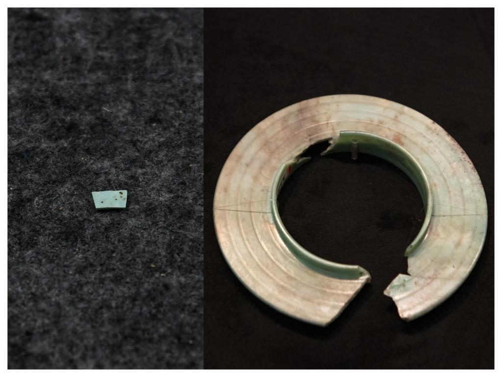 拼版照片:左圖為2024年7月10日拍攝的三星堆遺址出土的綠松石片(新華社記者王曦 攝),右圖為2024年7月21日在三星堆博物館文物保護與修復館拍攝的有領玉璧(新華社記者唐文豪 攝)。