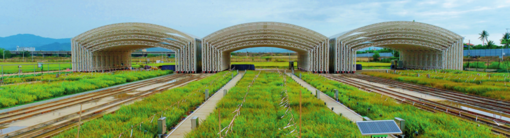 在位于三亞的國家耐鹽堿水稻技術創新中心崖州灣總部科研試驗基地,建設了高標準試驗田、鹽(堿)性精準鑒定鹽池、自動防雨鋼棚、水土鹽堿度智能化監測系統等配套設施(2024年5月17日攝)。黎多江攝/本刊