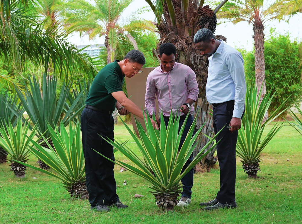 在三亞崖州灣科技城,非洲留學生跟隨中國熱帶農業科學院研究員易克賢(左一)在觀察劍麻育種材料長勢(2024年5月17日攝)。黎多江攝/本刊
