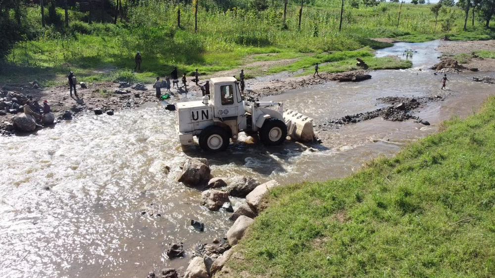 2023年6月7日,在剛果(金)南基伍省卡萊亥地區,中國第26批赴剛果(金)維和工兵分隊官兵進行施工作業。