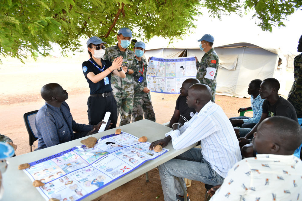 2020年3月,在南蘇丹首都朱巴,執行聯合國維和任務的中國維和警察廖潔給當地警察講解防疫知識。