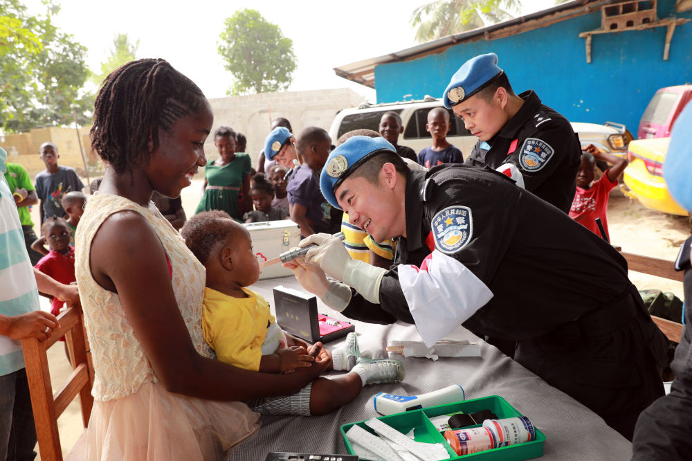 2017年12月28日,在利比里亞蒙羅維亞,中國維和警察防暴隊醫療人員為兒童做口腔檢查。