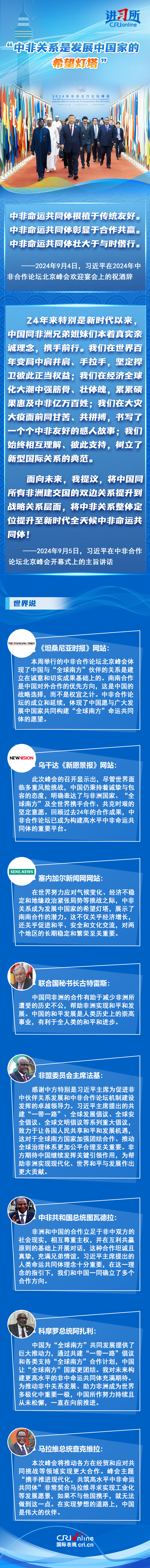 從宣布建立“新型伙伴關系”,到整體定位提升至“新時代全天候中非命運共同體”,成立24年的中非合作論壇不斷推動中非關系實現跨越式發展,特別是新時代以來,中國本著真實親誠理念,同非洲兄弟姐妹們攜手前行,受到非方廣泛稱贊。非方各界認為,為推動非中關系發展、助力非洲成為世界多極化中重要一極,中國所作努力持續且從未松懈,中非關系是發展中國家的希望燈塔。