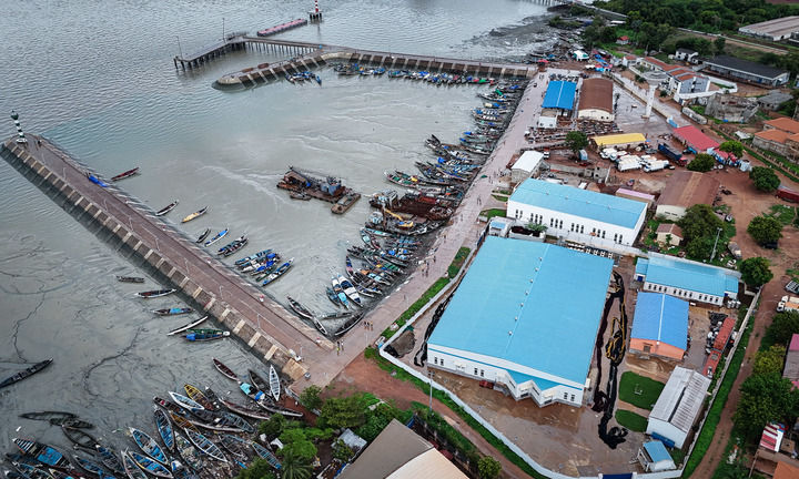 這是2024年7月8日在幾內亞比紹首都比紹拍攝的板丁漁業碼頭和中企投建的水產品加工存儲綜合設施(右側藍頂建筑區域)(無人機照片)。新華社記者 韓旭 攝