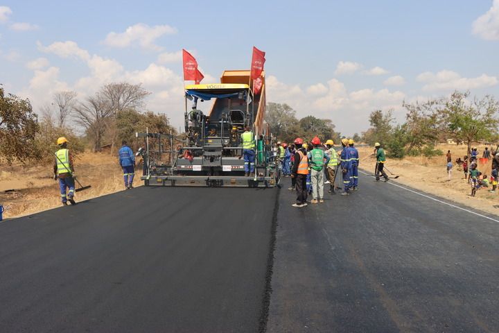 2024年8月27日,在馬拉維恩科塔科塔,施工人員在卡帕滕加至本加公路升級改造項目路段鋪筑瀝青路面。新華社發