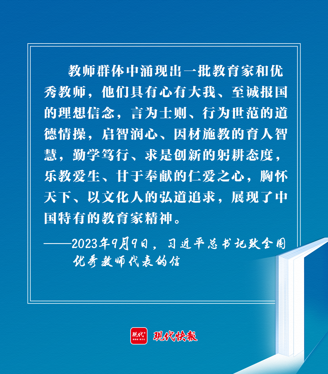 2023年9月9日,習近平總書記在致全國優秀教師代表的信中強調:“新征程上,希望你們和全國廣大教師以教育家為榜樣,大力弘揚教育家精神,牢記為黨育人、為國育才的初心使命,樹立‘躬耕教壇、強國有我’的志向和抱負,自信自強、踔厲奮發,為強國建設、民族復興偉業作出新的更大貢獻。”