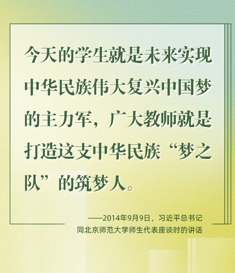 因為熱愛,所以一生堅持。老師是中華民族“夢之隊”的筑夢人,是新時代的“大先生”。從傳播知識、啟迪思想、無私奉獻,到“讓每個人都有實現夢想的機會”;從教書到育人,從個人到家國,從小我到大我,“培養德智體美勞全面發展的社會主義建設者和接班人”,老師,已然是喚起一代代學子追隨先輩、培養家國情懷、櫛風沐雨、砥礪前行的力量。