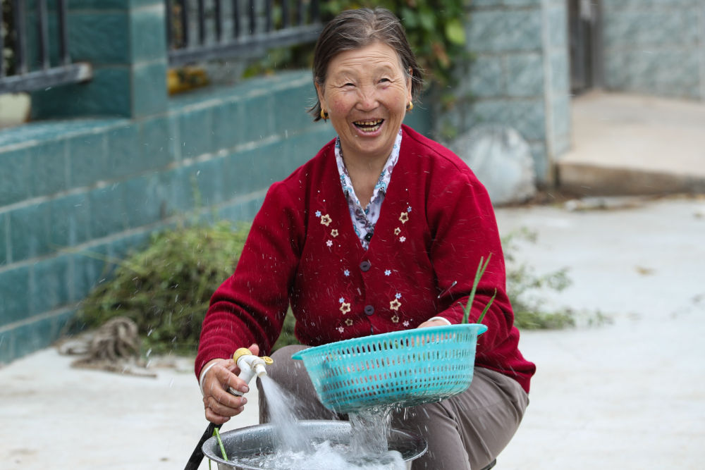 近日,在定西市隴西縣雙泉鎮(zhèn)癿羊口村,68歲的村民何淑蘭用引洮工程引來的自來水洗菜。新華社記者 郎兵兵 攝