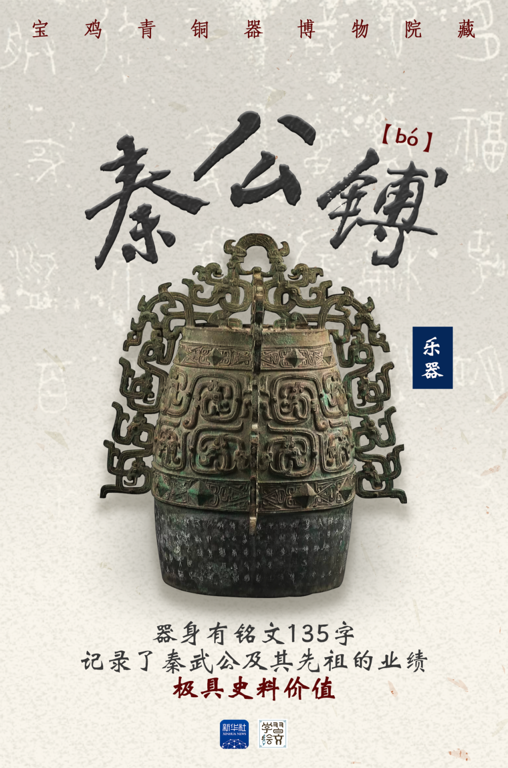 這件秦公镈是大型打擊樂器,器身有135字銘文,記述了秦襄公被周平王“賞宅受國(guó)”的歷史,以及文公、靜公、憲公三代治國(guó)興邦的業(yè)績(jī),是研究秦國(guó)早期歷史的重要實(shí)物資料。