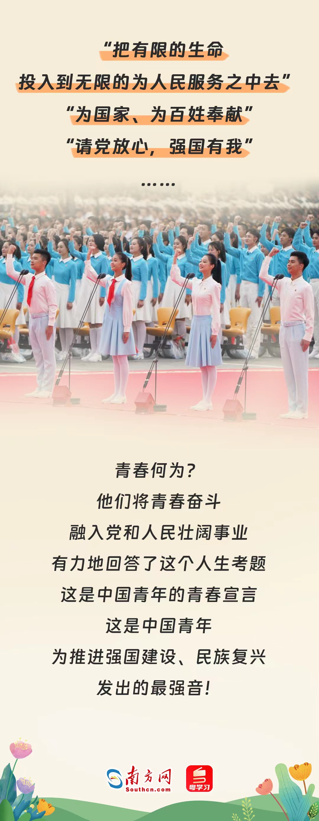 時代的每一次前行,都閃耀著青年奮勇拼搏的身影。一代又一代的中國青年滿懷對祖國和人民的赤子之心,積極投身黨領導的偉大事業,為人民戰斗、為祖國獻身、為幸福生活奮斗,用行動奮力踐行著自己的青春宣言。