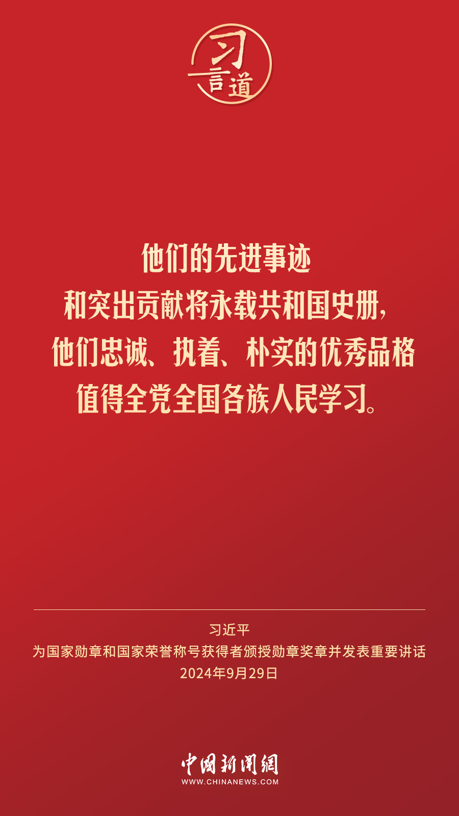 經中共中央批準,中華人民共和國國家勛章和國家榮譽稱號頒授儀式于9月29日上午10時在人民大會堂隆重舉行。中共中央總書記、國家主席、中央軍委主席習近平向國家勛章和國家榮譽稱號獲得者分別授予“共和國勛章”“友誼勛章”和國家榮譽稱號獎章并發表重要講話。習近平指出——