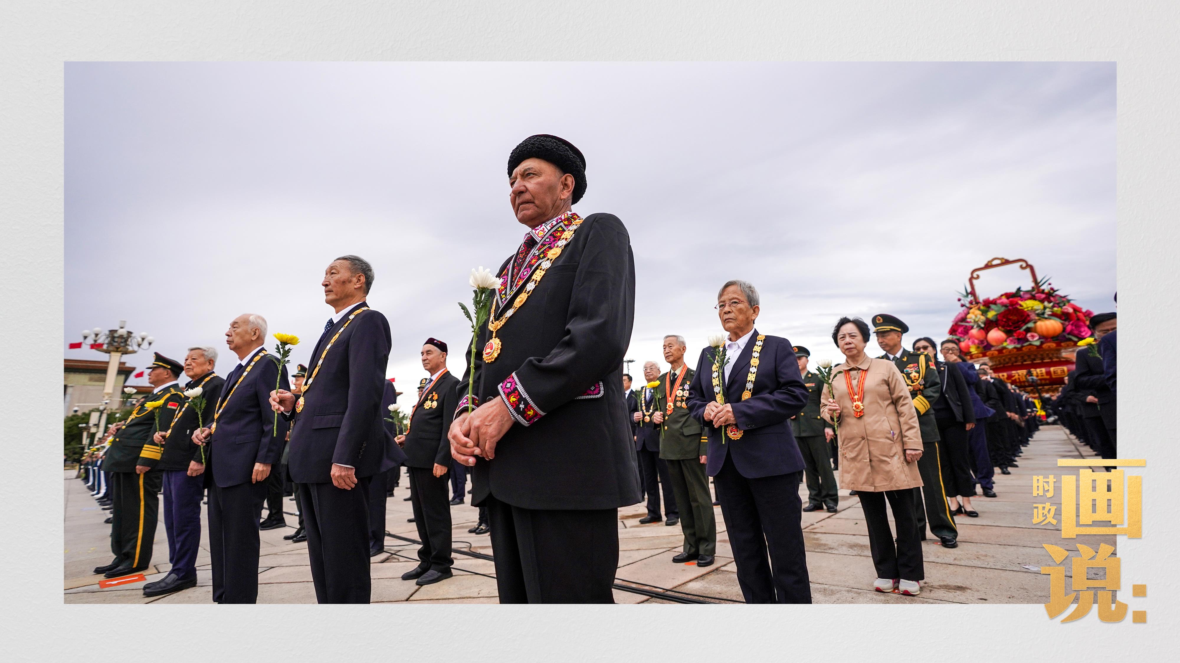 少年兒童和各界代表依次走到紀念碑前,獻上手中鮮花并瞻仰紀念碑。