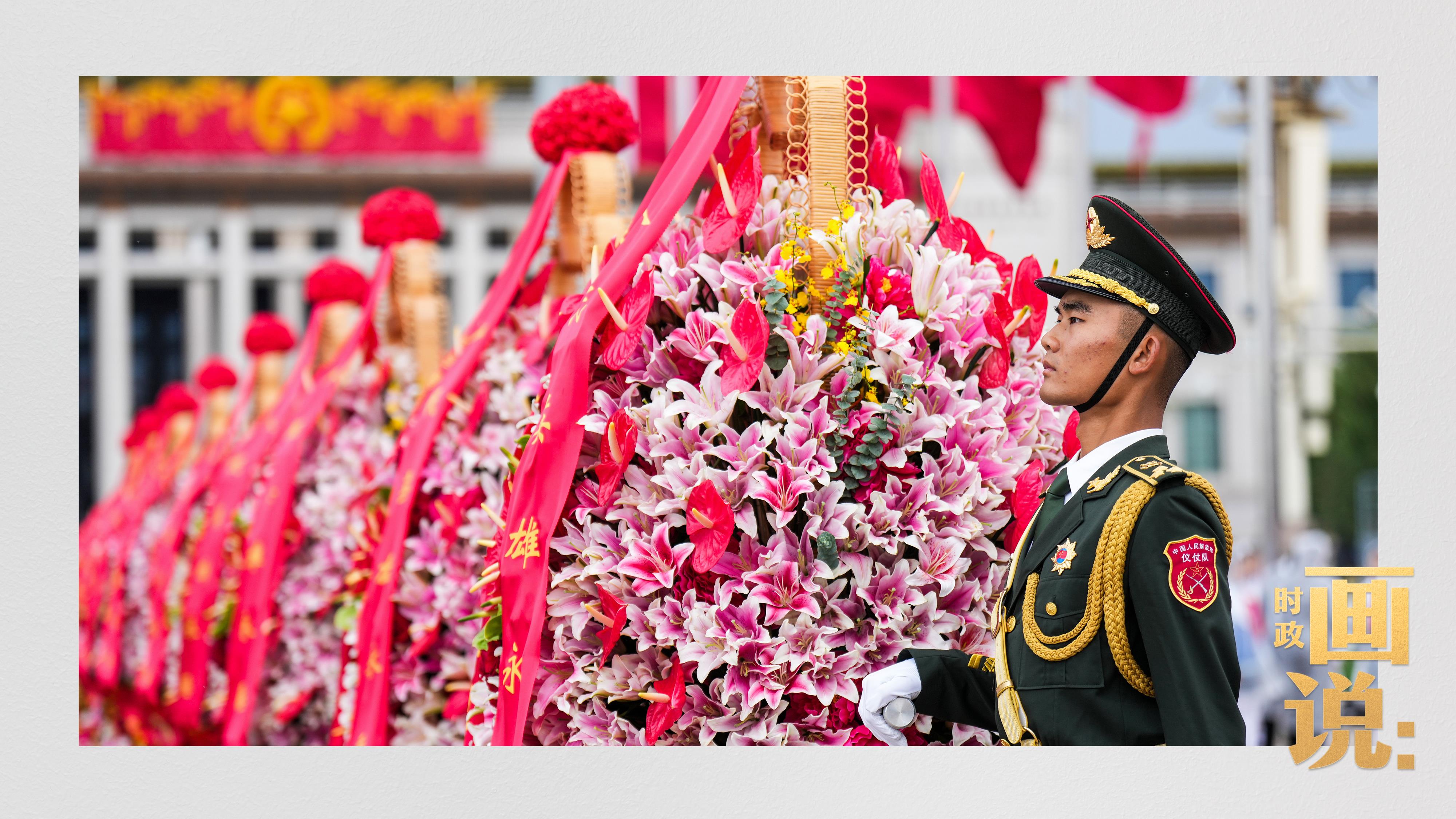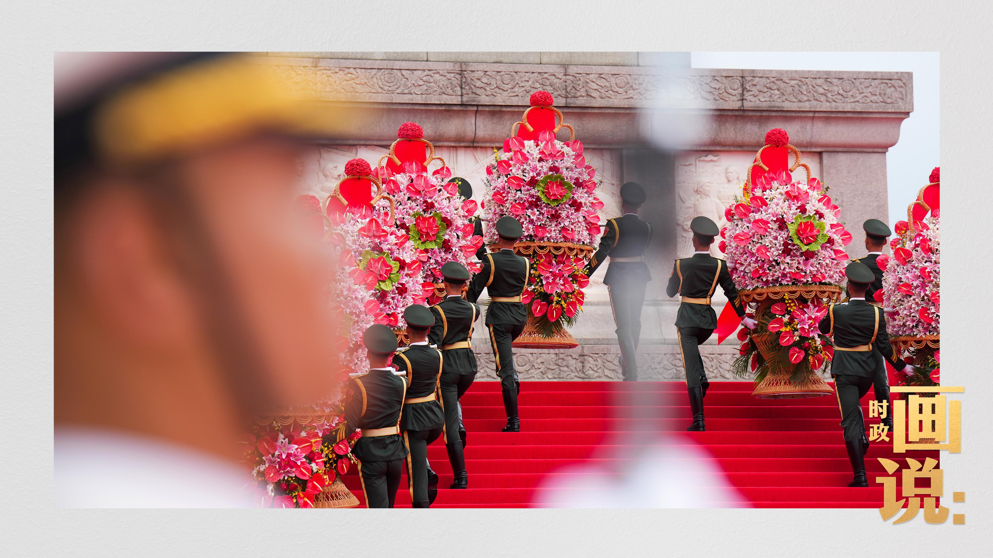 禮兵抬起花籃,緩步走向人民英雄紀念碑。
