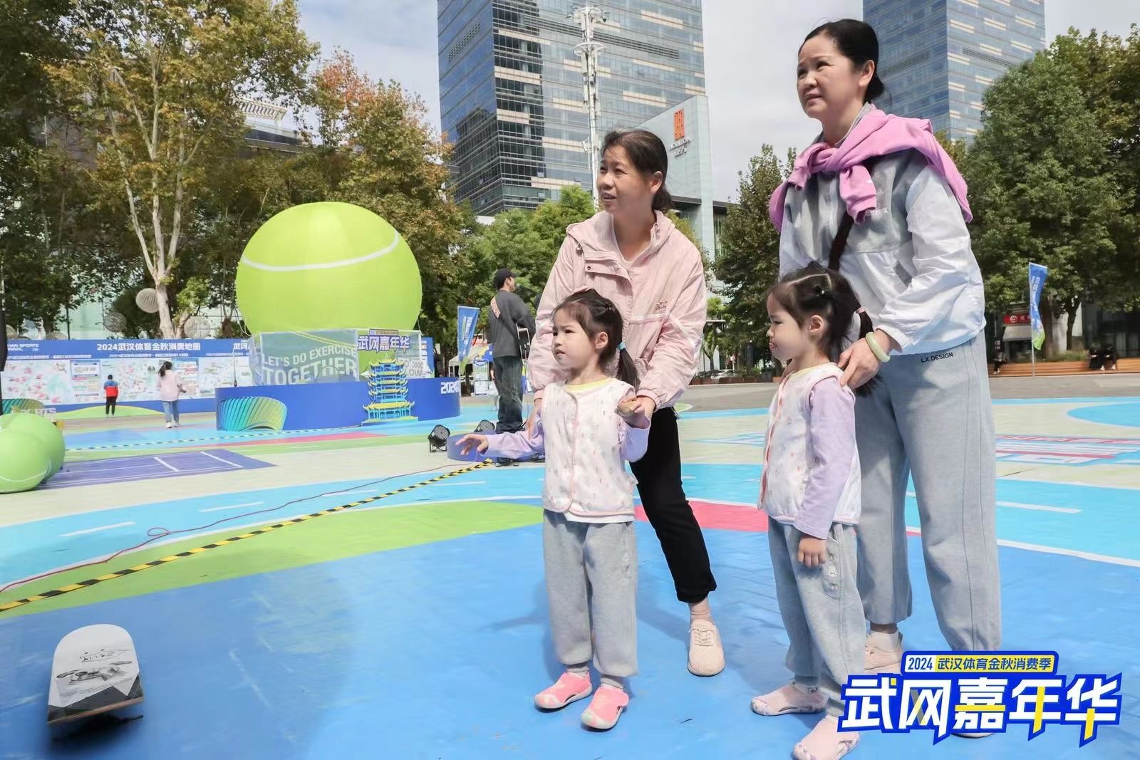 10月4日,武漢天地商圈熱鬧非凡,武漢體育金秋消費季——武網嘉年華分會場,琳瑯滿目的市集展銷,設置了網球、籃球、沖浪等多樣運動互動裝置,還有多個特色城市打卡點,吸引了市民游客前來體驗。游客樊女士介紹,專程帶孩子過來看比賽,平時也會打網球,在這里動一動熱熱身,很有意思。