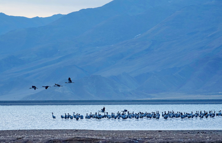 在雅魯藏布江中游河谷黑頸鶴國家級自然保護區(qū),黑頸鶴飛翔在一片水域上空(2024年3月17日攝)。多年來,西藏各級黨委政府和對口援藏省市接續(xù)投入2.4億余元資金開展生態(tài)建設(shè),創(chuàng)設(shè)的雅江北岸南木林生態(tài)示范區(qū)已完成造林4萬多畝,昔日戈壁荒灘漸變江畔綠洲,也成了黑頸鶴越冬的理想棲息地。監(jiān)測數(shù)據(jù)顯示,西藏境內(nèi)的黑頸鶴種群數(shù)量持續(xù)增長,已由上世紀(jì)的不足3000只增長到目前的1萬余只。