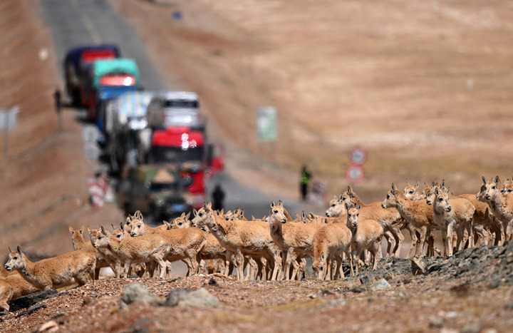 2023年5月29日,當(dāng)?shù)毓芾聿块T工作人員在青藏公路上臨時截停來往車輛,為一群前往可可西里卓乃湖產(chǎn)仔的藏羚羊讓路。可可西里地處三江源國家公園,是國家一級保護動物藏羚羊重要的棲息地。每年5月至7月,來自青海三江源、新疆阿爾金山、西藏羌塘的雌性藏羚羊會遷徙到可可西里卓乃湖,待產(chǎn)仔后再攜幼仔返回原棲息地。